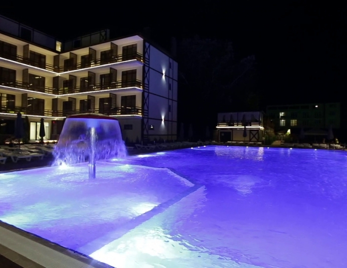 Гости комплекса «Хуторок» могут отдыхать возле большого открытого бассейна, который окружают шезлонги, зонтики для принятия солнечных ванн. Бассейн оборудован детской зоной, где дети могут наслаждаться купанием под присмотром взрослых.